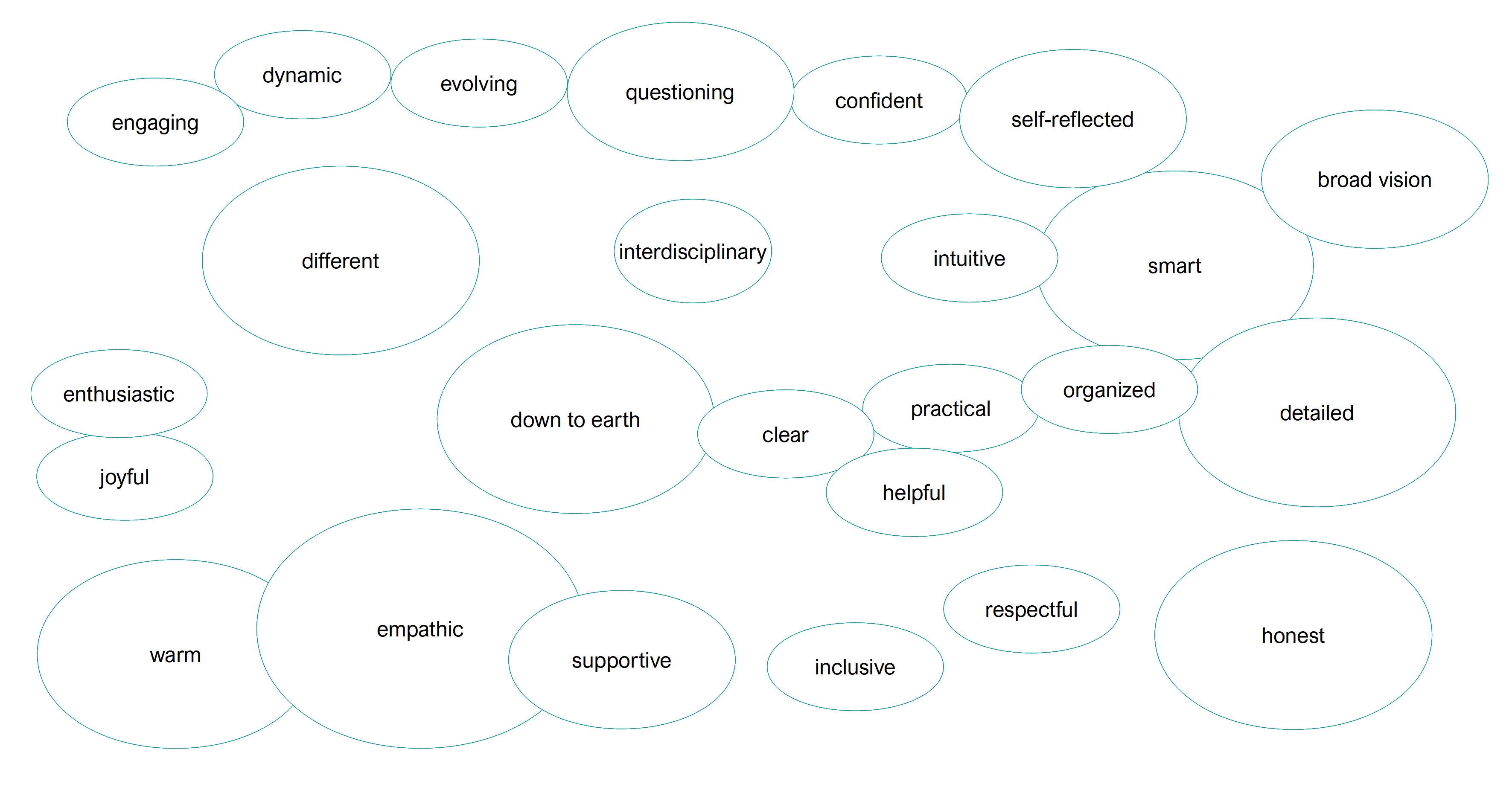 I have asked clients for words that describe what they valued about me in my work. Here are the results in a mind map. The larger the bubble, the more often a word and its synonyms appeared.